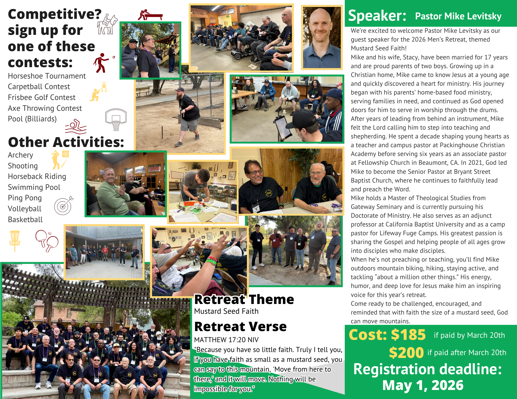 We’re excited to welcome Pastor Mike Levitsky as our guest speaker for the 2026 Men’s Retreat, themed Mustard Seed Faith!